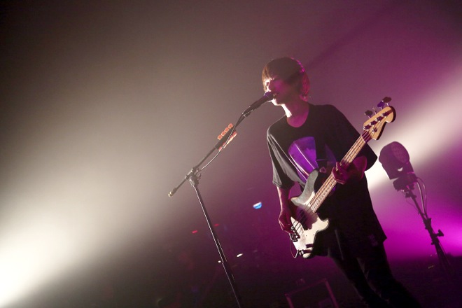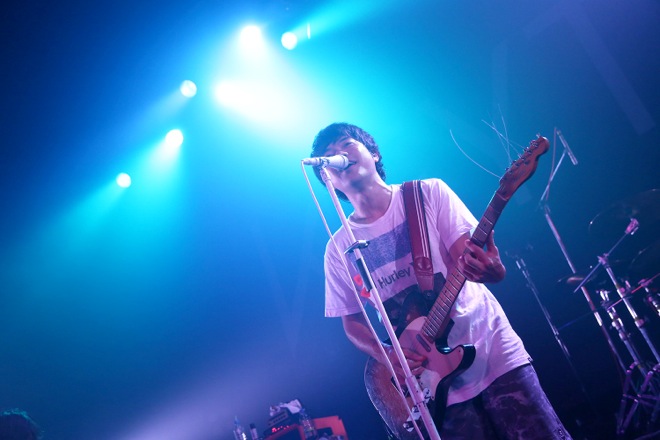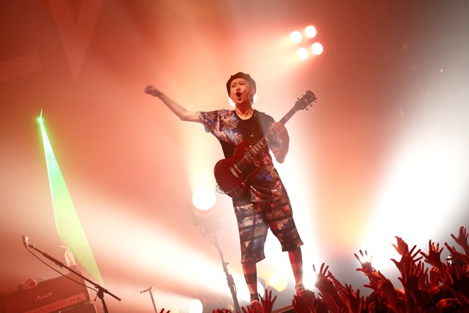 諸注意を読み上げる影アナを「巨匠」こと寺中友将(Vo./Gt.)と八木優樹(Dr./Cho.)が務め、早くも盛り上がった観客たち。そして会場内が暗転して巨匠、小野武正(Gt./MC/Cho.)、首藤義勝(Vo./Ba.)、八木がステージに登場。彼らはすぐに準備を済ませると、一丸となって爆音を轟かせた。1曲目に放たれたのは「HELLO WONDERLAND」。飛び交う何本ものレーザー光線の真下に広がる満杯のフロアが、瞬く間にダンス天国と化した。絶妙なツインヴォーカルのコンビネーションを発揮する巨匠&義勝、華麗なフレーズを連発する武正、エネルギッシュなビートを躍動させる八木。黄金のアンサンブルが、鮮やかに迫ってきた。