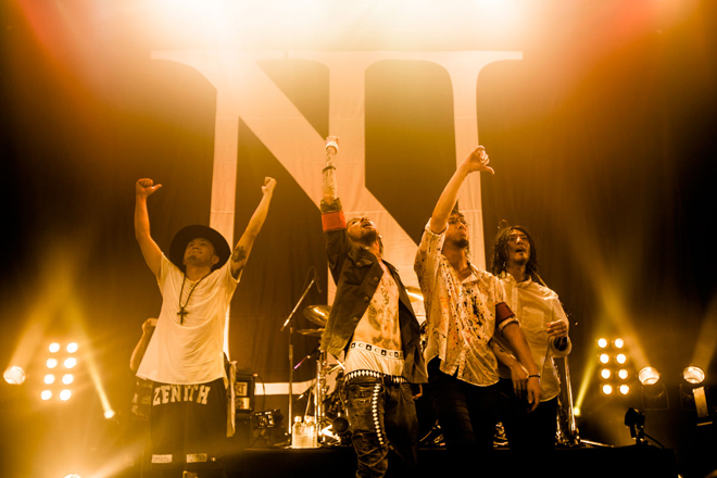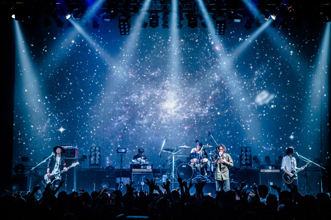 こうして迎えたツアーファイナルはソールドアウトとなり、会場いっぱいのBONERで埋め尽くされる。S.E.のボリュームが上がると同時に、幕で覆われたステージ前面に映し出されたのは、宇宙、地上から見る星、幾つもの街に降り注ぐ星たち、そしてThe BONEZのロゴと共に、悠然としたJESSE、T$UYO$HI、ZAX、NAKAのシルエット。次に幕が降りると、会場中を埋め尽くすBONERのシンガロングが、4人のメンバーを迎えいれた。