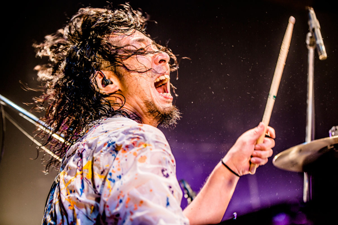 「Revolution」「Breath」を続け様にドロップし、ヒートアップしていく会場と共に、順調にステージが進んでいくかと思った矢先、ZAXのドラムペダルが破損し、演奏中断に見舞われる。しかし、ここからがThe BONEZの真骨頂とも呼べる“人間力”が繰り広げられることとなる。フリースタイルでラップを始めるJESSE、それに続き自然と反応するT$UYO$HI、ZAX、NAKA。慌てる素振りなど一切見せず、その時間さえもエンターテインしてみせるのがThe BONEZなのだ。