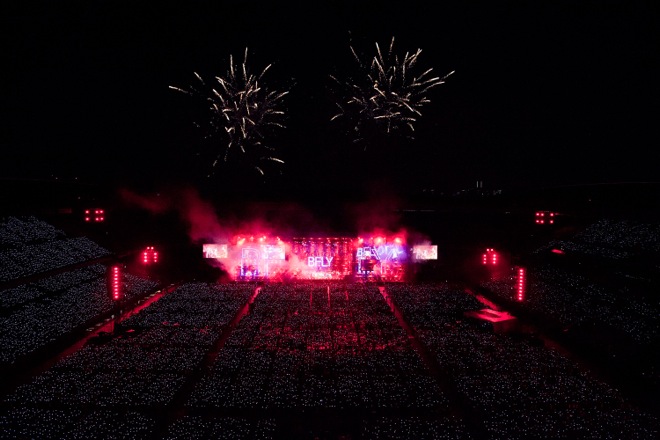 また、フィールド後方に設置されたサブステージでは、アコースティックセットで「孤独の合唱」「ダンデライオン」を優しい音色で奏で、続く「GO」では明るさと物悲しさを併せ持つ曲調によってバンドのスキルを見せつけた。さらに「虹を待つ人」では、BUMP OF CHICKENのライブではおなじみとなったチームラボボール が「Butteflies」ロゴをあしらったバージョンで登場。赤、青、黄、緑とさまざまなパターンで光るチームラボボールと、光るリストバンド「PIXMOB」が共鳴し、スタジアム全景を虹色に染め上げるシーンも。スタジアムのスケールを生かした演出が場内にどよめきを呼んでいた。