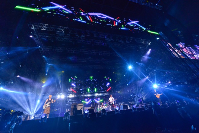 今ツアーのために制作されたインストゥルメンタルをBGMに、スクリーンでカウントダウンが終了するというドラマチックなオープニングであったが、それに続いてライブの開幕を告げたのは「Hello,world!」だ。続けて「パレード」の持つ不穏当かつ性急なビートで、フィールドをあっという間にBUMP OF CHICKENの楽曲世界に引きずり込む。