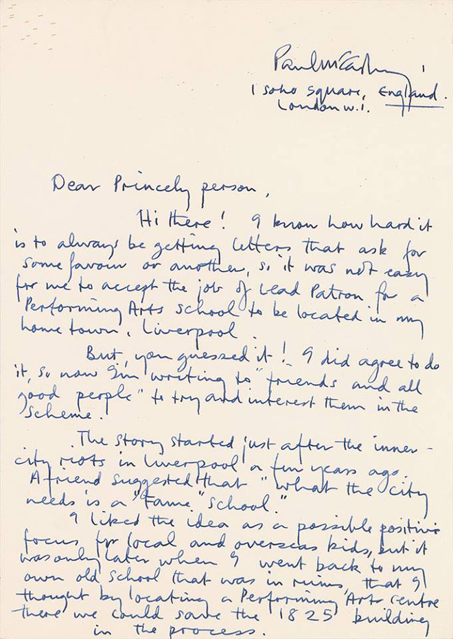 日付がないため正確なところは不明だが、『Liverpool Echo』紙によると1980年代初めに書かれたというこの手紙は、「Dear Princely person(皇子のようなお方へ)」と始まり、ポールが故郷リバプールに共同設立することになった舞台芸術学校Liverpool Institute for Performing Arts(1996年開校)への寄付をお願いする内容。「授業で君の動きを教えて欲しい!」とも記している。