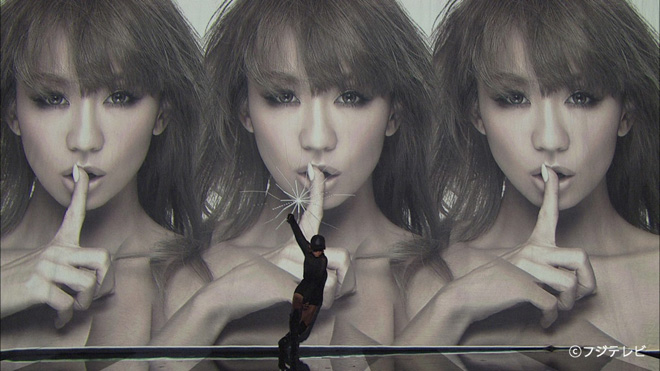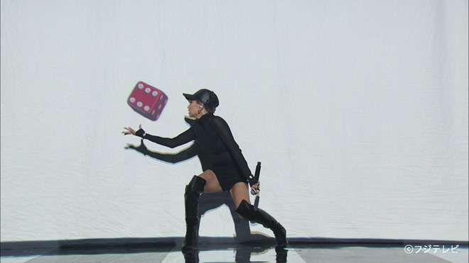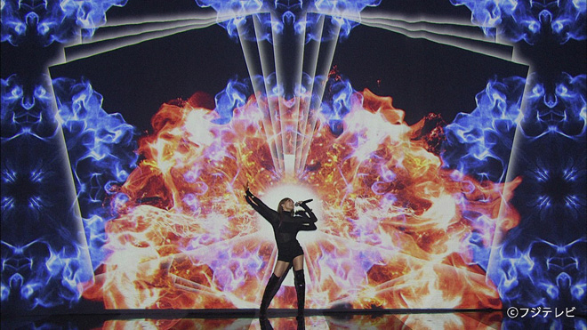 約7.2m×約11mの巨大なマッピングカーテンに映し出されたプロジェクションマッピングと、この日の演出の為に作られたダンスをシンクロさせたもので、昨年15周年を記念して開催された<KODA KUMI 15th Anniversary LIVE The Artist>でも、衣装にプロジェクションマッピングを投影するなど、最先端の試みが採り入られていたが、テレビでは今回が初披露となったものだ。