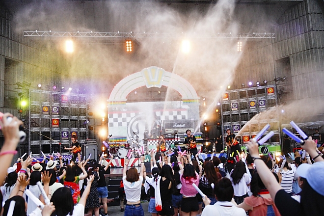 「W-B-C “若人Baseball Classic”」でステージ上から水を噴射させた後、4人はそれぞれ会場の中央から後方まで、所狭しと動き回り、立ち見のお客さんの前でもパフォーマンス。自己紹介ソング「We are DISH//」、ベースのRYUJIのセリフに黄色い声が上がった「クイズ!恋するキンコンカン!」、メンバーによる自作曲で等身大のパーティーソング遊び要素たっぷりの「Shall We Dance????」など、サマーソングを連発し、お祭り騒ぎの様相となった。