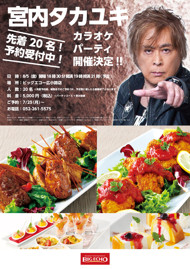 特撮やアニメなどの主題歌などでおなじみの宮内タカユキが、名古屋・栄のビッグエコー広小路店でスペシャルなカラオケ・パーティを開催する。現在、先着20名の予約を受付中だ。