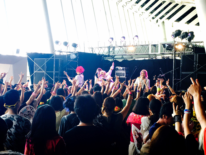 そして2曲目の新曲「†夏☆大好き!ヴィジュアル系†」で会場全体がタオルぐるぐるで一体となりアドレナリンが噴き出した。息つく暇もなく「ゴリラ」ではfeaturing16が予想外の行動へ。なんと会場に降り立ち、ゴリラの振り付けを全員にあおる。男子がそれに応え、即席ゴリラパフォーマーが誕生した。