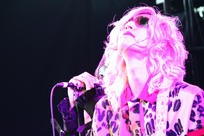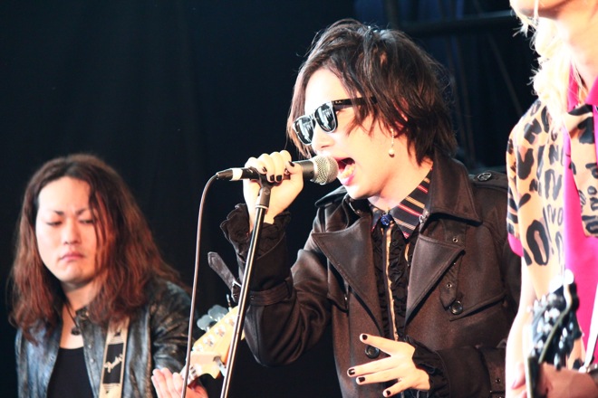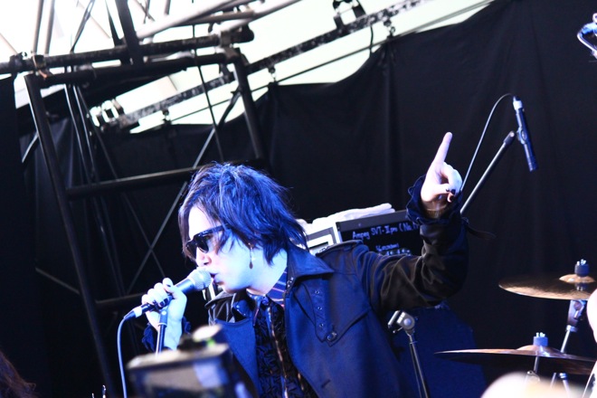 オープニングSEから”インダストリアル版オペラ座の怪人”とも呼べる吐息と轟音が混じる独特のサウンドでオーディエンスを自身の世界へ誘う。Bryan(vo)は黒のロングコートとサングラスで仁王立ち。豹柄+ピンクのシャツをまとったWin(G)はニューロマンティックに派手さと品を加えたルックスと、そのスタイルも存在感も圧倒的だ。そして1曲目は、SOFT BALLETを彷彿させるハードなシンセが印象的なテクノとメタルを往来する「ヴェルヴェット思想家」を披露した。