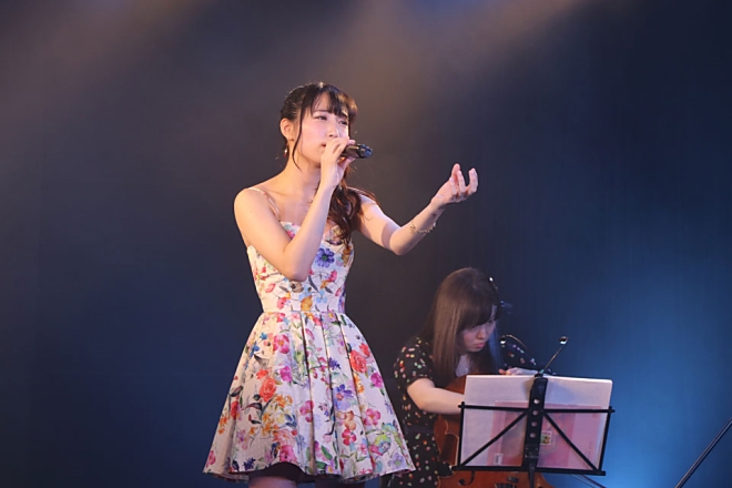 嬉しいお知らせの後は、チェロとバイオリンを迎えての生演奏コーナーへ。ファンからも生演奏コーナーのパフォーマンス曲を募ってその中で2位となった思い出のデビュー曲「君といた空」をアコースティックアレンジで快活に歌いあげ、3年の成長を魅せた。さらに投票1位となったドラマ「ワカコ酒」のエンディングテーマに起用されていた「星たちのモーメント」は聴く人の背中をそっと押すメッセージがストリングスにのせて柔らかくファンを包んだ。さらにカバー曲「オリビアを聴きながら」とオリジナルでは初めての失恋ソング「シナモンティー」と、恋の終わりを告げる曲が続く。一気に切ない表情で聴かせる2曲に心が揺さぶられる。18歳という大人と子供の間にいる上野優華の繊細な感情の変化が美しい。MCでは今日この日を、上野優華を応援してくれる全ての人への感謝を伝え、その全ての想いを込めて、「ありがとうを君へ」を歌唱。会場全体にハートフルなムードが沁み渡り、本編は終了した。