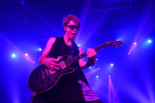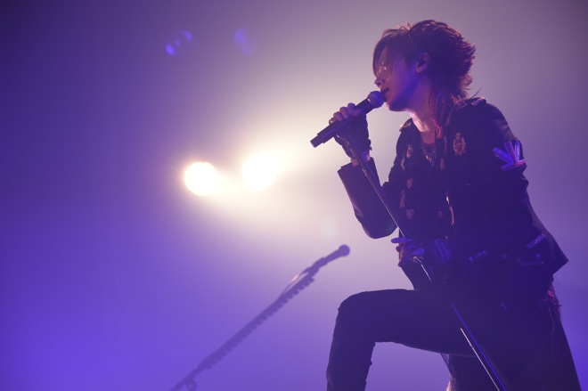 ステージが暗転し、ブルーの光にステージが照らされると大歓声。AKIHIDE、SHINPEIが姿を現し、最後にDAIGOがダンサーとともにステージに登場、オープニングはいきなりライヴのキラーチューン「REAL LOVE 2010」だ。センターのランウェイのDAIGO、上手、下手のAKIHIDE、SHINPEIの立ち位置に仕込まれたリフトがどんどんせり上がっていく派手な演出に場内も大興奮。そしてもちろん、DAIGOがAKIHIDEの首の鎖を引き寄せ、キスする演出も。アニバーサリーにふさわしい度肝を抜く幕開けから3人がアグレッシヴにステージを動きまわる「FAKE LOVE」、「Everlasting Luv」へと前半からエンジン全開のステージが繰り広げられた。SHINPEIのパワフルで小気味いソロからAKIHIDEのテクニカルに聴かせるソロへと2人のギタリストがBREAKERZサウンドにエッジと華を添え、フロントマンにふさわしい吸引力を持ったDAIGOのヴォーカルが場内をひっぱっていく。無数に上がる場内の拳。女性ファンに負けじと男性ファンの声も飛ぶ。