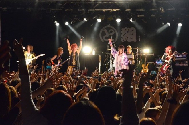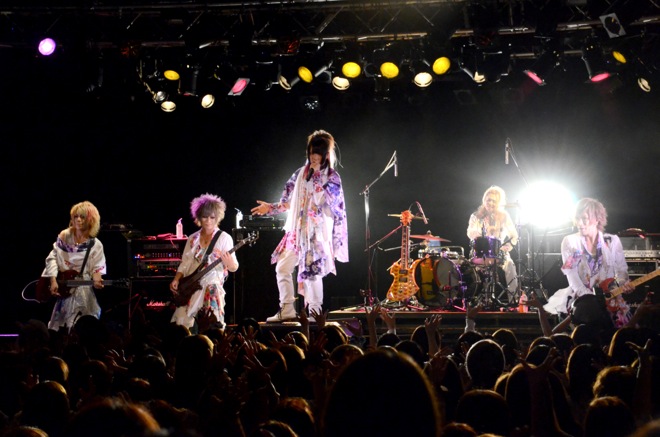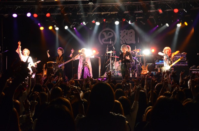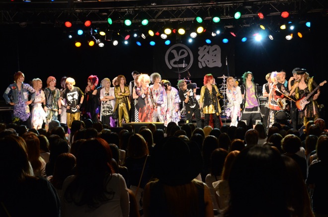 そして大トリのT組「Aaron5」は、ボーカルに夕霧(DaizyStripper)、まゆ (DaizyStripper)とGAKU (FEST VAINQUEUR)のツインギター、コーヤ (ASTARIA)とKAZI (FEST VAINQUEUR)のリズム隊による5ピースだ。体も心もビッグサイズ(?)のAaronと先ほどと打って変わって和んだ雰囲気の夕霧が先導し、「sell my soul(L’Arc〜en〜Ciel)」「LOVESICK~You Don’t Know~(SIAM SHADE)」といった選曲で明るく温かく優しく、この日を締めくくった。