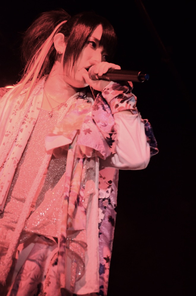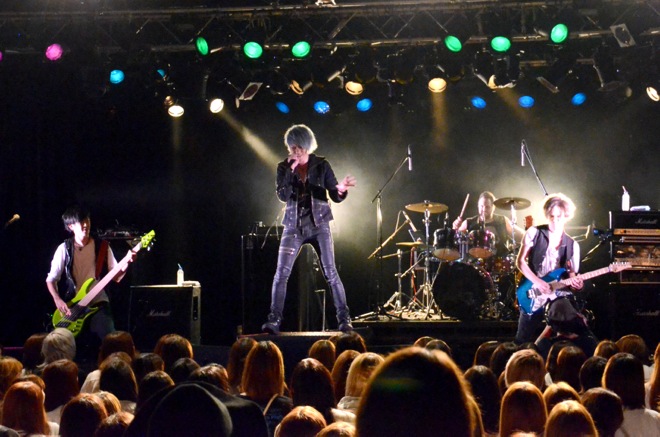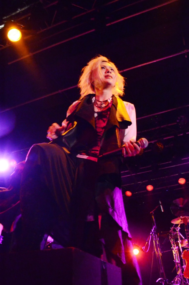 トップバッターとして登場したASTARIAは若手ながら名古屋のV系シーンを牽引する注目株だ。幕を閉めたままレーベルの大先輩DaizyStripperの「星空と君の手」を演奏し、客席をざわめかせるサプライズからスタートすると、80年代バブルのディスコを彷彿とさせる新曲「Dancing rendez-vous」、リズムにのせて扇子を仰ぐ「MARMALADE BUTTERFLY」で、イベントの幕開けを華々しく飾った。