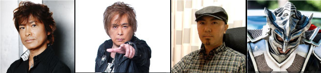 ▲左から声優の古谷徹、歌手の宮内タカユキ、作曲家の田代智一、銀鯱ヒーローORCA。