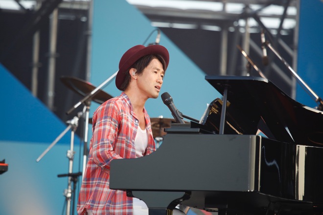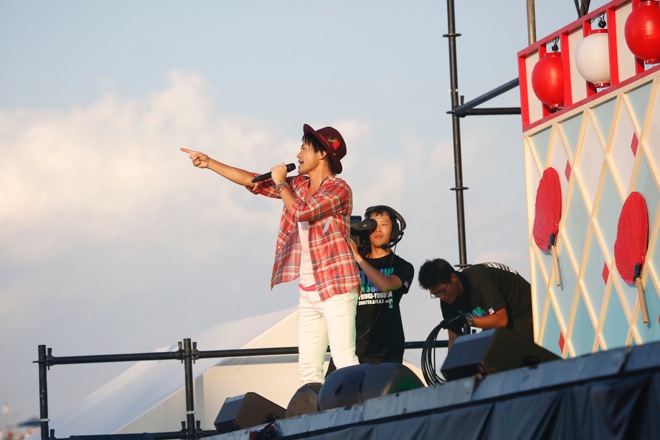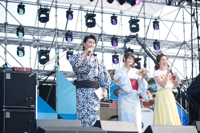 続いては、野外イベントで本領を発揮するお祭り男、ナオト・インティライミが「ZIP!夏祭り!アー・ユー・レディ?」と叫びながら、勢い良く登場。おなじみのナンバー「いつかきっと」でライブがスタートし、オープニング曲を歌ったあと、「もう終わってもいいくらい(笑)」とテンションを上げながら、2曲目にはバラードの新曲「Overflows~言葉にできなくて~」をピアノの弾き語りで歌った。「夕日と海と風と空と、最高だね!みんなの雄叫びをきかせてー!」と3曲目以降はアップテンポ・ナンバーの応酬だ。ラストの「カーニバる?」ではゴムボールでリフティングをしてから客席へ蹴り込んだり、イベントMCのMAKIDAIと北乃きいに加え進行役の郡司アナもステージに引っ張り出して一緒にタオル・パフォーマンスを行い、最高の盛り上がりを見せた。