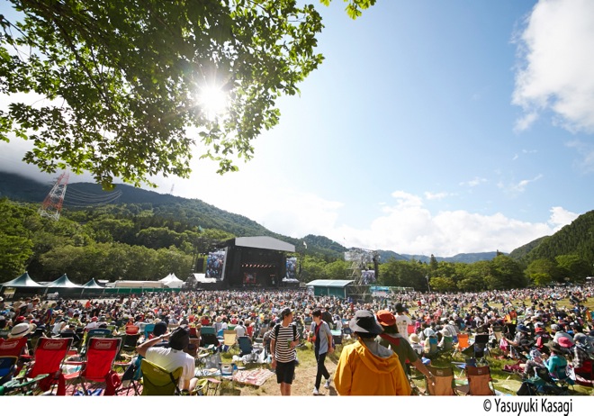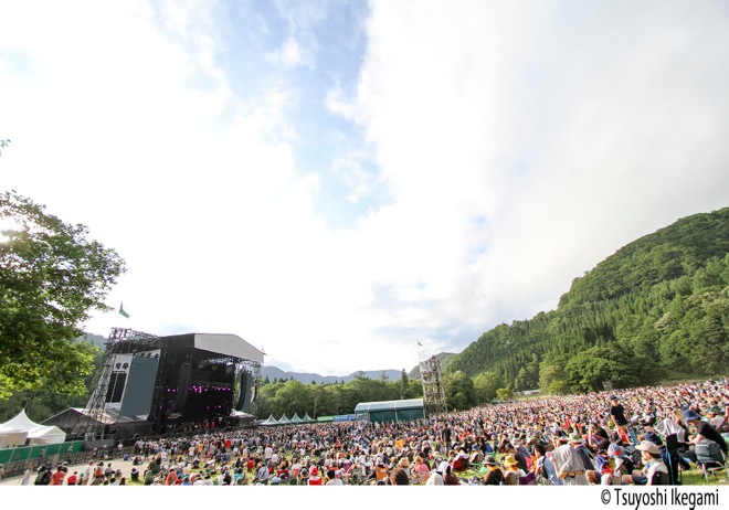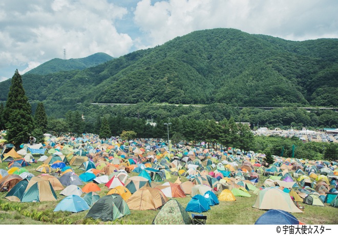 初日7月22日(金)の午前10時30分。入場ゲートは、自撮りだったり他人に頼んだりと、とにかく写真を抑えようとする人で大混雑。けれど、はしゃぐ他人の笑顔につられて気分がよくなるという、都心との逆転現象が起こる。むしろこの20回目のフジロックのはじまりをSNSでみんなにぜひ伝えて欲しい、と情熱的な気分にさえなった。そしてICチップ入りのリストバンドを観察しつつ晴天の中を歩いてゆくと、忌野清志郎の「田舎へ行こう!」のBGMが聴こえてくる。道行く人はフジロックのテーマソングとして作られたこの曲を口ずさみながら、グリーンステージにどんどん流れていった。
