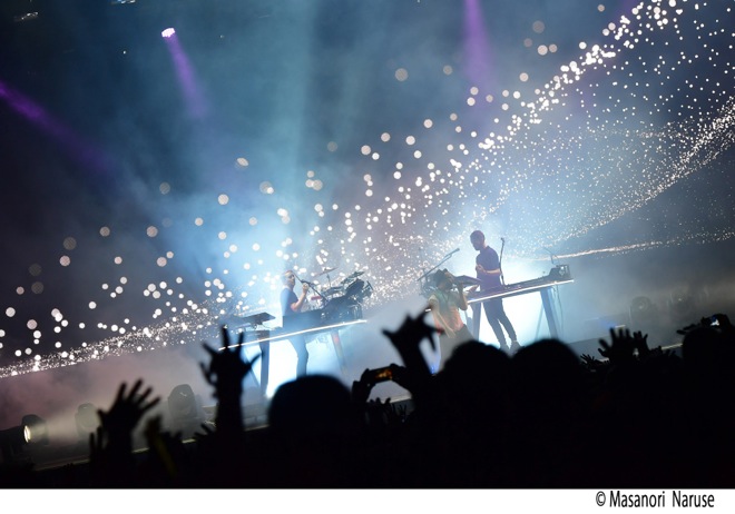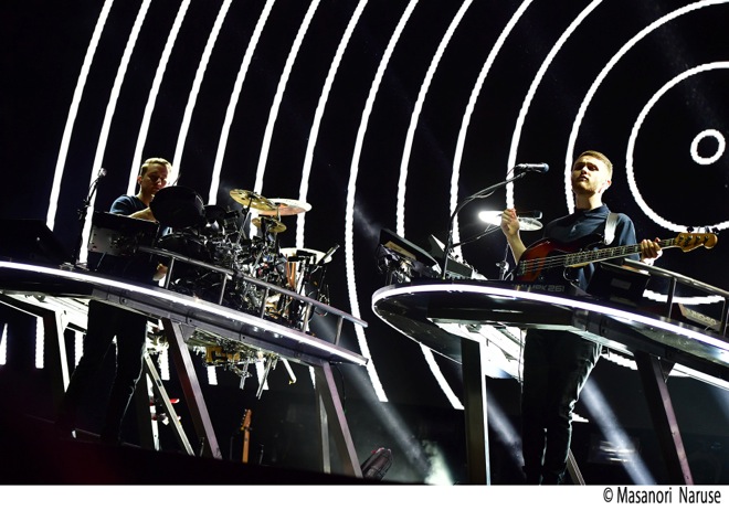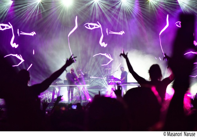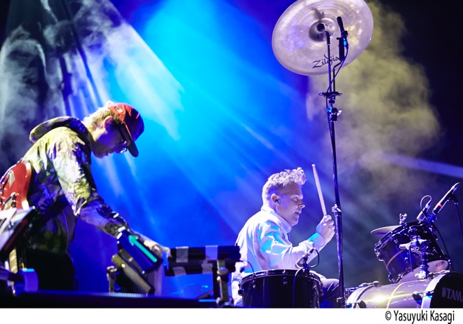 まずは初日のディスクロージャーだ。あの宇宙ステーションのような半円型のセットが神々しいほど、ふたりは洗練され自信に満ち、そしてプロフェッショナルだった。しかも、「ニホン、ダイスキ!」とフランクに呼びかけたりと、あくまでもオープンマインド。歌い・弾き・叩くという生演奏の躍動に当たり前のように観客は沸き立ち、歌のフレーズの合唱が起こるほど私達を無邪気に踊らせ楽しませた。