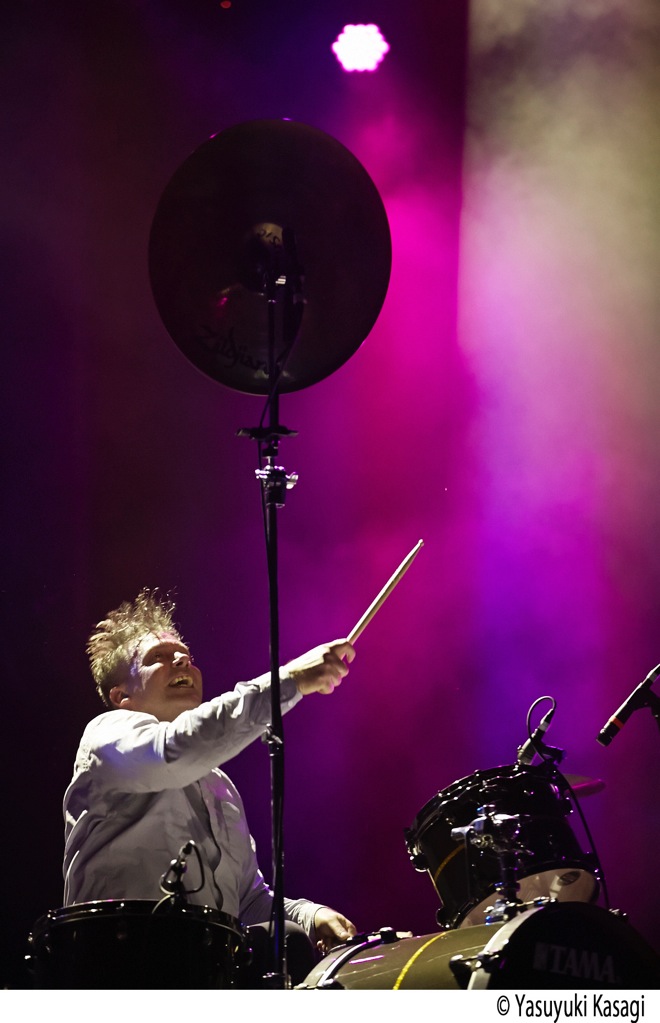 そして3日目のバトルス。ザックリ言うと、ひたすら中央でドラムを叩き続けるジョン、そして細かく音を構築していく2人という3人が作り上げていくライブだったと思うが、その微塵も落ちない集中力と体力にとにかくあっけにとられた。1時間半の演奏を完走した瞬間、なんだかホワイトにいる全員が達成感を覚えたような激走であった。