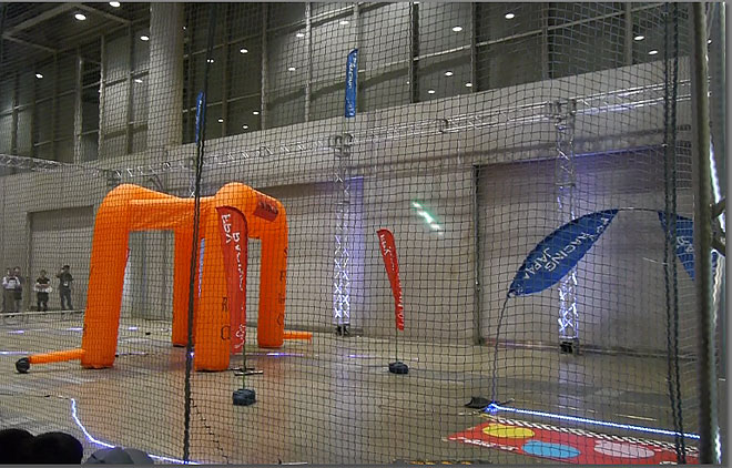 ▲網越し&あまりに速すぎてわかりにくいが、中央右あたりの緑の光が飛行中のドローン。床にはテープ状の照明装置がある。ドローンの動きに連動してこの照明と音がコントロールされる。