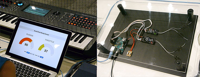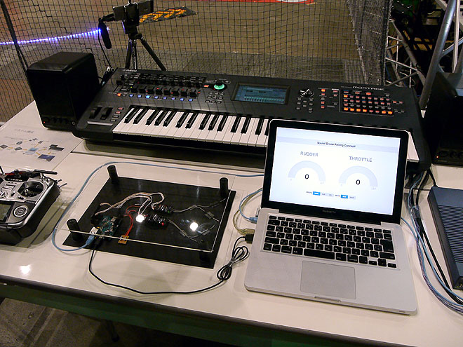 その一例として今回提示されたのが、ドローンのフライトデモ。ドローンのコントローラーからの信号を受信機-Arduinoを介してパソコン上のCreators’ Hubに送信、MIDIに変換してシンセサイザーを演奏、OSCで照明機器を制御するというのがおもな仕組み。Creators’ Hubにより、今後さまざまなデバイスがつながっていくことが実感できるデモとなっていた。