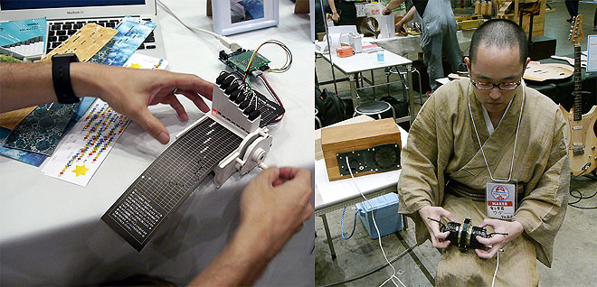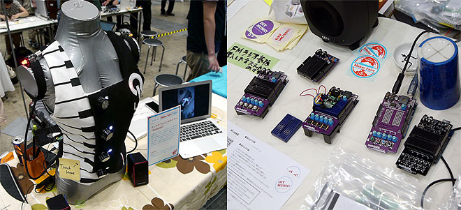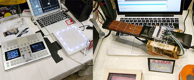 ▲左はu.kokolabによるウェアラブル心セサイザー「Cardiaction!」は着用者の心電波形からも音源を生成。模様の鍵盤が実際に引けて、ツマミでシンセの音色変化も。右は昼用な音を得るために電子回路から作るDIYバンド「The Breadboard Band」のブース。ArduinoとサウンドライブラリMozziのためのシールド基板「mobileBB shield for Mozzi」は販売も実施。