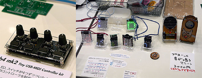 ▲こちらもDm9 Records。左はツマミ、LED、スイッチが各4個付いたUSBコントローラーを制作するキット。その場ではんだ付け、制作できるハンズオンも実施。右はLEDマトリクスペンダント(キット販売)と「プヨーっと音が鳴るマシーン」。電池とスピーカー内蔵で確かにプヨーっと音が鳴る(謎)。