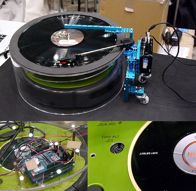 ▲お掃除ロボットのルンバでDJをしていたのはDum6 Sen5e。「Create 2 DJ Turntable II」はiRobotルンバを用いたアナログ・ターンテーブル。ルンバのメンテナンス用端子とArduino(写真下)を使いコントロール。PCに接続したMIDIコントローラーのボタンを押すと、ターンテーブルが逆回転(もちろんルンバも逆回転)、スクラッチまで可能。自動車の自動運転プログラムを使っているとのこと。すごい!