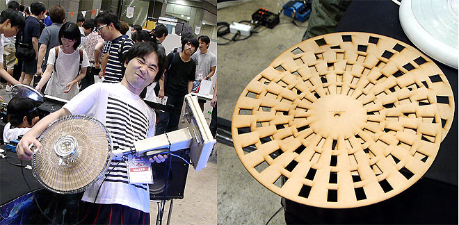 ▲扇風機をギターのように抱えて演奏(?)していたのは和田永「エレクトロニコス・ファンタスティコス!」。扇風機には羽の代わりに右の穴の空いた円盤を取り付け、後ろから光を当てる。羽の穴を抜けた光をCdSという光を検出する部品で受け取り発音する。穴の空け方でスケールが変わり、回転速度でピッチが変わる。