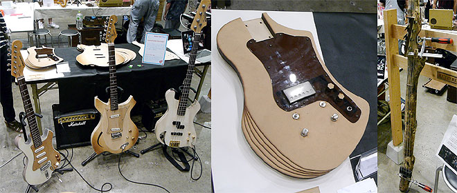 ▲デジファブギター工房はパソコンのデータからレーザーカッターでカットしたMDFの板を重ねて作ったギターを展示。少ない手間で好きな形にできるのが利点。ただし意外と重い。一番右は万力を用いたネックやボディが存在しないギター。万力で挟めればどんなものもギターになってしまう!