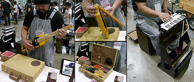 ▲blues walkerは折りたためるエレキギター(ケースはアンプ内蔵)や3つの鍵盤ハーモニカを使い足踏みで空気を送れる楽器(これも折りたたんで箱にしまえる!)を展示。手回しオルガンや木製のスマホ用スピーカーなども。