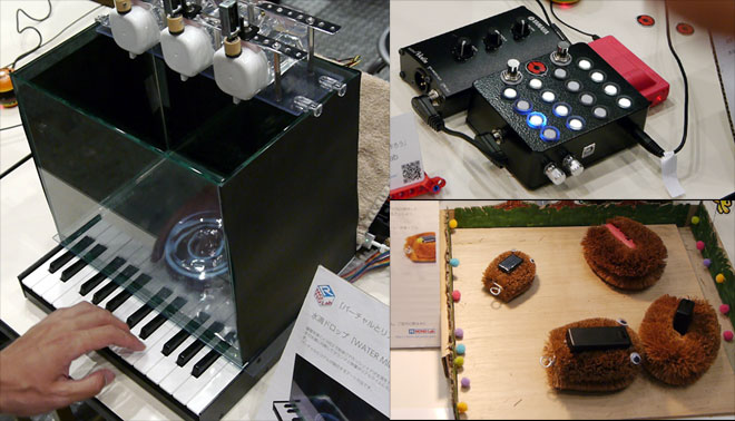 ▲R-MONO Labの作品。左は鍵盤をたたくとMIDIで制御されたソレノイドが水滴をドロップ、その水滴に同期してサウンドと映像がリアルタイムに生成されるアート作品、水滴ドロップ「WALTER MIDI」。水面に見えたと思った波紋は、水槽の底にあるMacBookのディスプレイに表示された映像だった。右上は16ステップのトレモロ・エフェクター、右下は自走型たわし。バッテリー内蔵モデルとソーラー発電モデルがラインナップ。