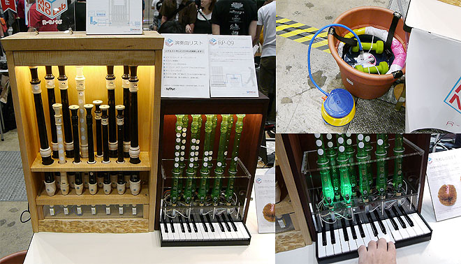 ▲R-MONO Labのハイブリッド・リコーダー・パイプオルガン。RP-103とRP-09。リコーダー9本を使ったRP-09のフットプリントはA4サイズしかない。空気を送るのは人力(右上のポンプ使用、ある程度空気が溜まれば重りによりしばらくは空気を送り続けられる)だが、リコーダーの弁の開閉はPC、Arduinoを使いMIDIにより制御されている。鍵盤で弾けるし、PCによる自動演奏もOK。