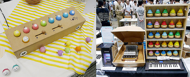 ▲子供が大喜びで触っていたのがPanon Musicによる「loop(ループ)」(写真左)。箱に空いた穴に球形の「音のつみき」をはめるだけで曲が作れる楽器。左下の顔のつみ木で音色も変えられる。本体内にはArduino、背後のMacでCycling ’74 Maxが動いている。写真右は株式会社スリックのMIDI対応オルゴール「カナデオン」とハンドベルにMIDIインターフェースを搭載した自動演奏ハンドベル「ベルナール」。これもかわいい。