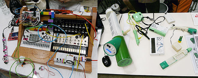 ▲モジュラーシンセに憧れて作られた小型ラック「モジャラーシンセ」を展示したのは立体音楽団(写真左)。コルグvolcaなどを複数収納できるラックにステレオミニジャックのミキサーも用意。さらにlittleBits用スペースもある。左上ブレッドボードのジャンプワイヤがモジャッと感。写真右は3Dプリンタと電子回路による歌う電子楽器「ぼかりこ」などを展示したnegi.moeのブース。ポケット・ミクやRaspberry Piが使われている。