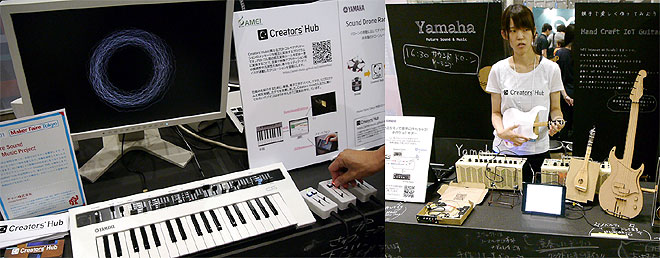 <Maker Faire>の会場内はいくつかのゾーンに分かれており、楽器・音楽関連の出展の多くは「ミュージック&サウンドゾーン」に集まっている。子供が喜びそうなかわいい楽器から、映像と音楽のシンクロ、一見音楽とは関係なさそうなお掃除ロボットや扇風機を使ったぶっ飛んだものまで、ユニークなアイディアに満ちた出展が揃っていた。ここではスポンサーゾーンはじめ他のゾーンの出展もあわせて紹介する。