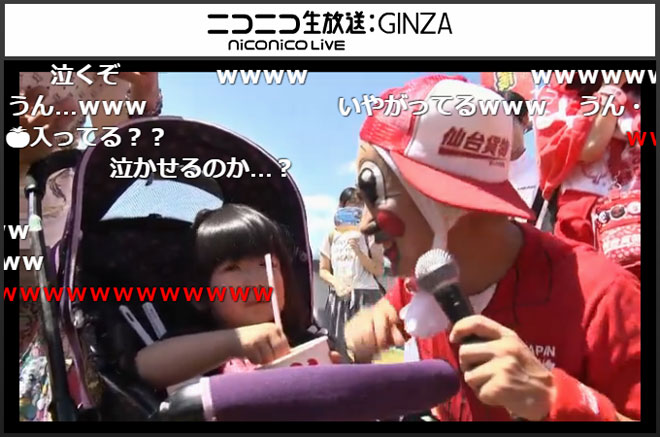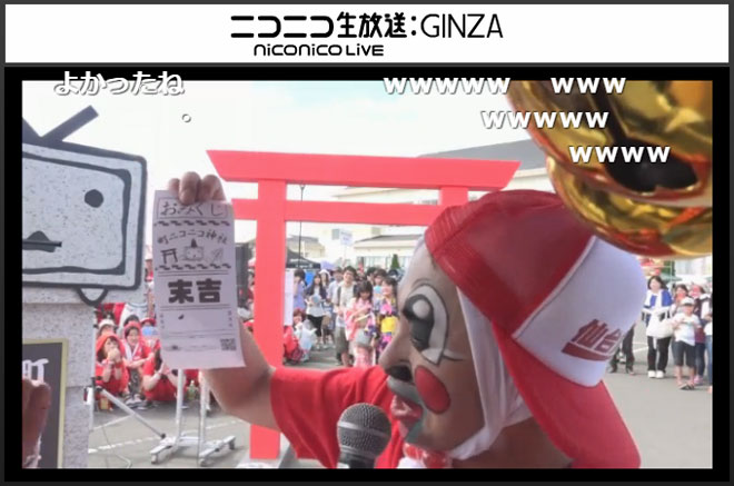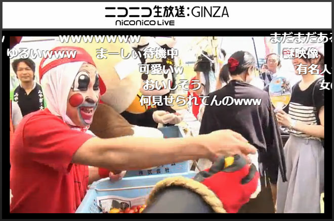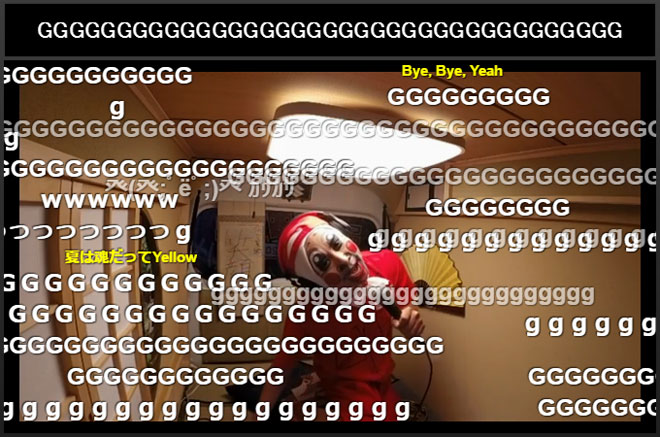 続いてイガグリ千葉が現れたのは、「町お一人様カラオケ」。「昨日飲み過ぎて気持ちが悪いです。歌いながらゲロを吐いてしまったらすみません」と彼らしいコメントで生放送視聴者を盛り上げると、サザンオールスターズの「マンピーのG☆SPOT」を披露。歌詞に出てくる「女」を「男」に変えたり、サビでは「G連打して!」と視聴者を煽って「G弾幕」を起こすなどの自由な振る舞いに、「さすがプロwwww」「千葉さん盛り上がりまくりww」「安定して面白いな」「千葉さん、サイコーです!!」といったコメントが書き込まれた。