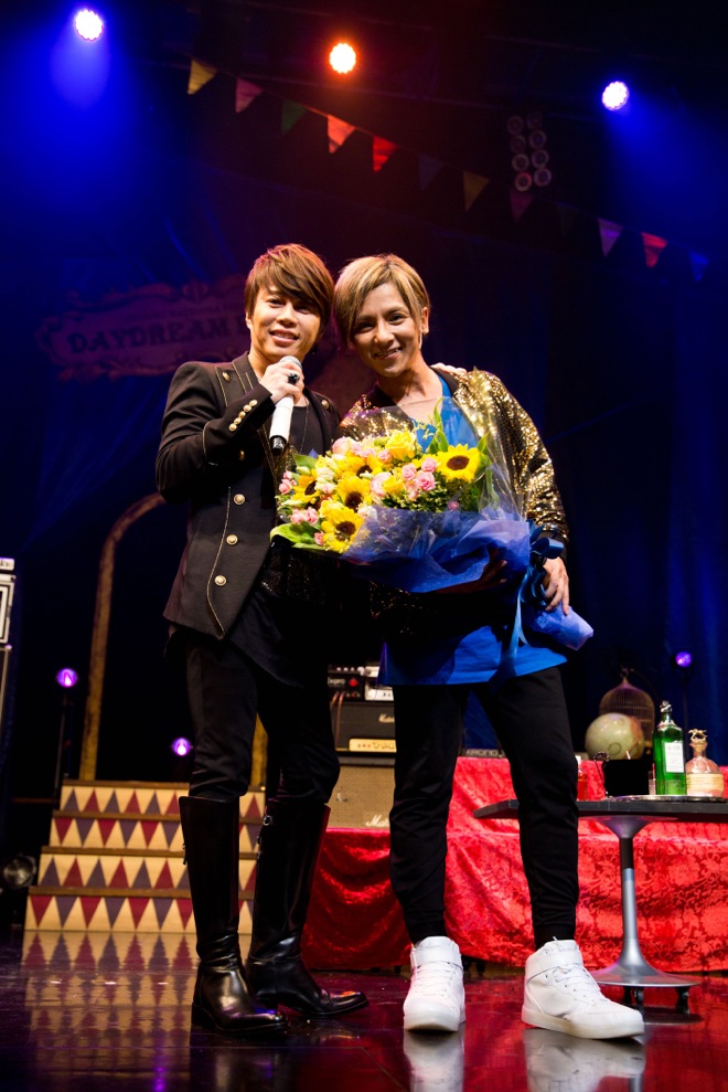 すると、舞台後方から大きな花束を抱えた西川貴教がスターオーラ全開で登場。その姿を見て狂喜乱舞するキャストと観客たちに「長いわ! いつになったらウチのくだりになるんか。照明の隙間のせっまいところでずーっと45分間、待たされてたわ」と西川。場内は一瞬にして大爆笑に包まれる。その後「とにかくおめでとう」と松岡に花束を手渡すと、これまたガチで一人だけ何も知らされていなかった松岡は本気で絶句。「えっ! まさかこのためだけに大阪に?」と松岡に聞かれ、「そうよ。ちゃんとお祝いしたことなかったから。お金じゃなくて俺の時間をプレゼント」と西川は笑顔をみせた。デビュー前の若かりしアマチュア時代、関西でヴィジュアル系バンドとしてお互い切磋琢磨していた頃からを知る先輩と後輩。そんな彼らの時代を超えた絆のつながりの深さを感じさせるビッグサプライズに、集まったファンも大感動の一幕となった。