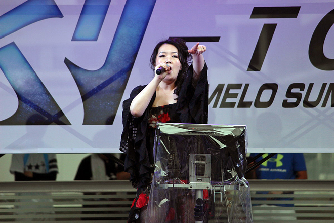 アニサマが始まった2005年からのカウントダウンに続いていよいよ本大会がスタートすると、1番手にはALI PROJECT「聖少女領域」を歌う女性、摂政さんが黒と赤の大人っぽい衣装でステージに上がる。歌声はキュートでとても個性的だ。さらに「楽しんでますか~!?」とマイクを呼びかける余裕を見せてくれた。続く★板橋~防災士★さんは、ハッピにサングラス姿という異色なスタイルで人目を引きつけながらTrySail「High Free Spirits」を歌うと熱い観客から野太い歓声が上がりノリノリに。「この盛り上がりをスタジアムに持って行ってください!」と観客に呼びかけた。
