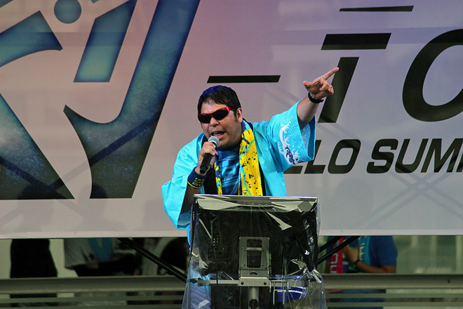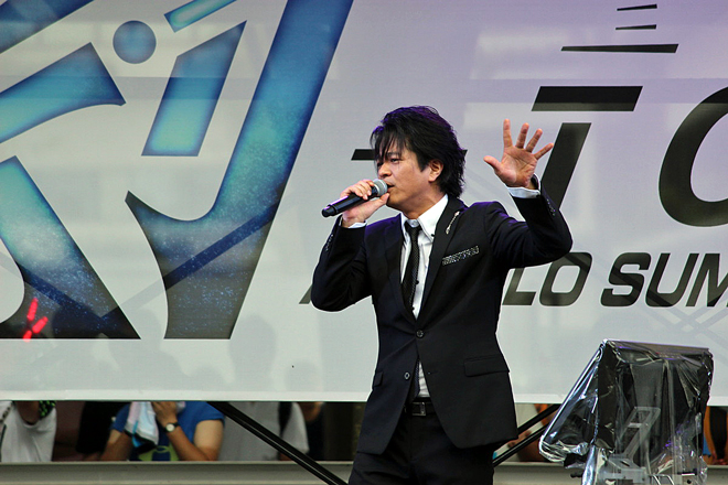 「お前ら元気かー!」と観客を煽ると、「ウォー!」とものすごい歓声で迎えられた。MCの武石も「浅岡さん、ようこそいらっしゃいました!本当にご本人がここにいらっしゃると思うと興奮であまりしゃべれません!」とテンションが上がっている。少しでも近くで見ようと、遠くから眺めていた人たちもどっとステージ近くまで押し寄せた。おなじみの大ヒット曲、アニメ『ドラゴンボール GT 』主題歌の「Dan Dan 心魅かれてく」のタイトルを挙げ「知っている人!?」と呼びかけるとまたしても「ウォー!」と声が上がり「俺、男の野太い声大好きなんだよ!」と浅岡。さらに「自分の曲でオタ芸やってもらったことないんだよ!ぜひ頼むよ!いけるのー!?後ろもいけるー!?」とトークで目一杯盛り上げてから「Dan Dan 心魅かれてく」へ。前半から合唱が起こり、サビで「カモーン!」と煽るとジャンプしながら大合唱が起こり「すげえぞー!!」と浅岡も笑顔を見せながら気分が良さそうに歌う。