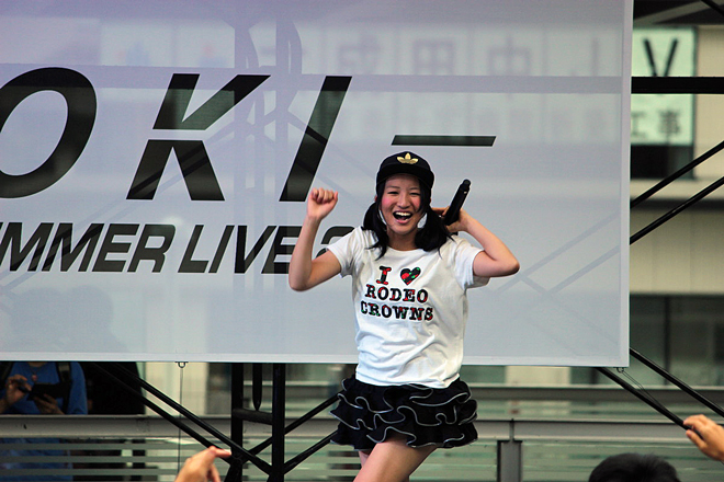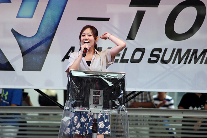 本日のオープニングでは制服ファッションの女性・リコさんが登場。「こんにちは!μ’sの「それは僕たちの奇跡」を歌います!」と告げると、さすがに大人気グループ、さらに2015年の「第66回NHK紅白歌合戦」に出場した際に歌った曲ということもあり、ひろばの周囲から見ていた観覧者も「うぉー!!」と一斉に特設ステージに駆け寄り、ひろばは早くも後ろの方までぎっしりと埋まる大盛況。会場のテンションを一気に上げてオープニングの大役を務めた。