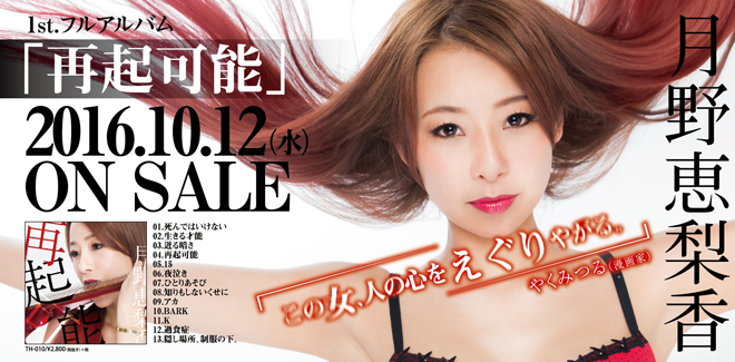 ご予約者優先でタワーレコード池袋、新宿、渋谷のいずれかの店舗にて、10/12発売(10/1入荷)月野恵梨香『再起可能』(TH 010)をお買い上げいただいた方に、先着で特典券を差し上げます。