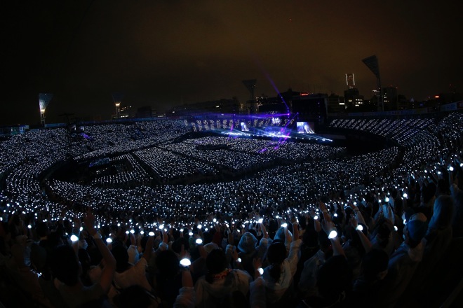 特筆すべきは本編ラストの「THE DAY」だ。オーディエンスのシンクロライトが点灯し、会場全体に「THE DAY」の文字が浮き上がる。その様子がドローンで空撮され、会場が一体となった。シンクロライトは同曲に合わせ、様々な色に変化して会場は光りの海に。そんな光と音楽の融合で盛り上がりは最高潮に達した。