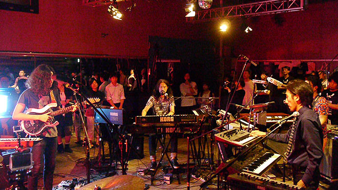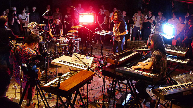会場となったのは下高井戸G-ROCKS。一歩足を踏み入れるとそこには数多くのKORGシンセとドラム、ギターなどがずらり。ステージは設けられず、中央に並んだこれらの楽器を、5人のメンバーが向かい合って演奏するという配置。その周りを観客が取り囲む。普通のライヴとはまったく異なる雰囲気だ。