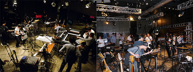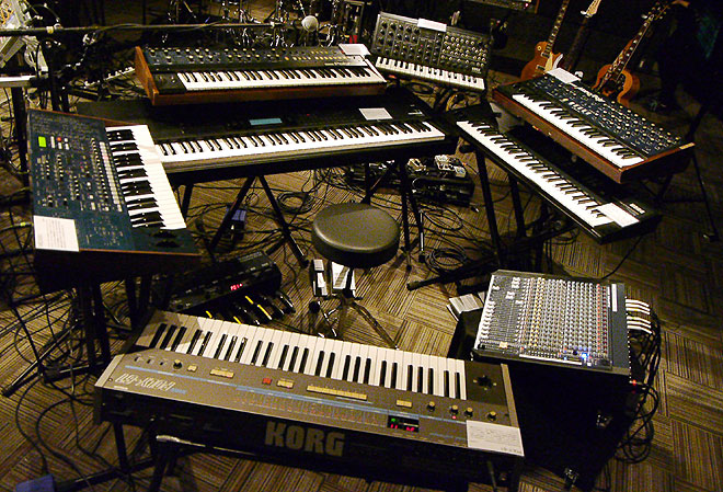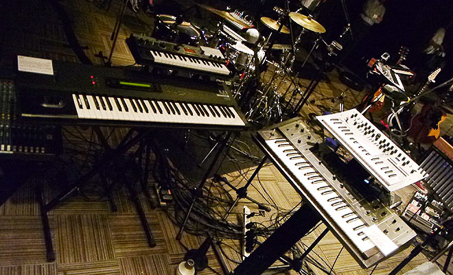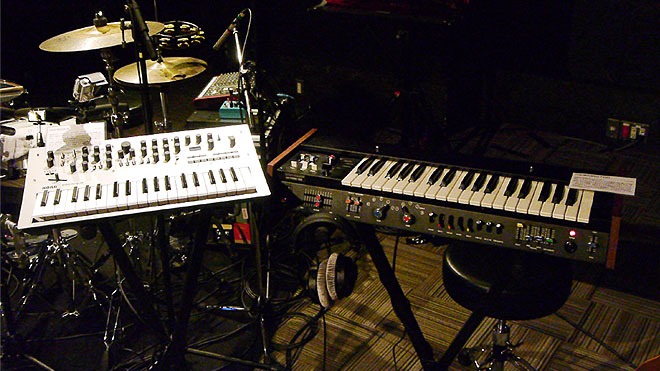 ▲ずらりと並んだシンセやギター、ドラムはすべてこれからのライヴで使われるもの。