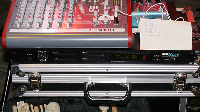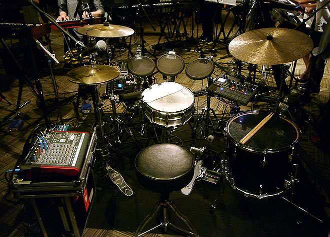 ▲ドラムの左のラックにあるKORGのヴィンテージドラムマシンDRM-1は本体で設定を変えられない仕様のため、演奏の間にリモコンで設定が行われた。