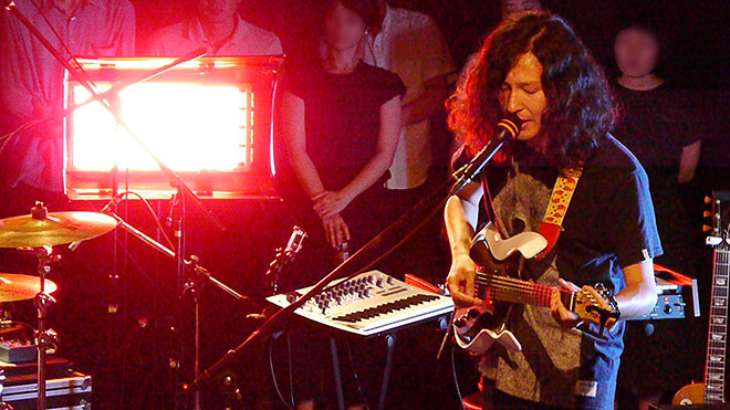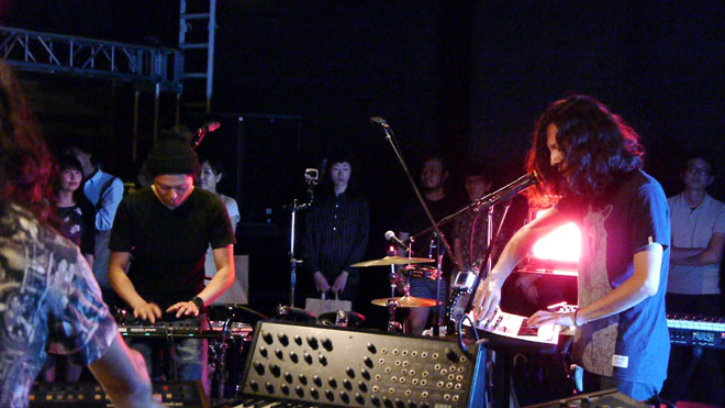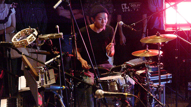 ハイトーンなボーカルとKORGシンセにより紡ぎ出されるサウンドスケープ。サポートメンバーの西池達也(Key)、竹内悠馬(Tp、Per、Key)、大田垣正信(Ba、Tb、Key)によるさまざまな楽器を交え、重層的な音空間が広がっていく。アナログシンセならではの時に太く温かいサウンドに、ギター、ベース、ドラムにトランペットやトロンボーンなども加えたオーガニックなサウンドに観客はうっとり。