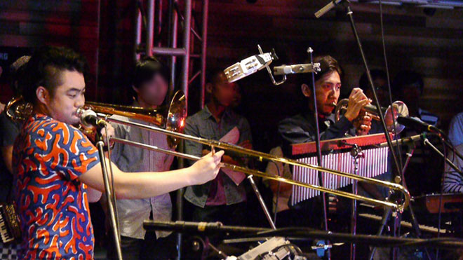 ▲左から大田垣正信(Ba、Tb、Key)、竹内悠馬(Tp、Per、Key)。
