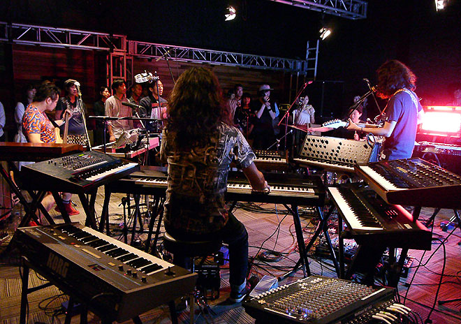 開演前の約1時間は、ライヴ用にセッティングされたこれらのKORGシンセを観客が自由に触れるというのが、<KORG SESSION>ならではの趣向。普段は触ることも見ることもできないようなヴィンテージシンセの数々を、実際にツマミと回したり鍵盤を弾いたりと、自由に楽しむ観客。もちろんライヴ用に用意されたシンセだけあって、音もバッチリ。試奏だけでなく、写真を撮ったりとシンセ好きにはたまらない時間が流れる。