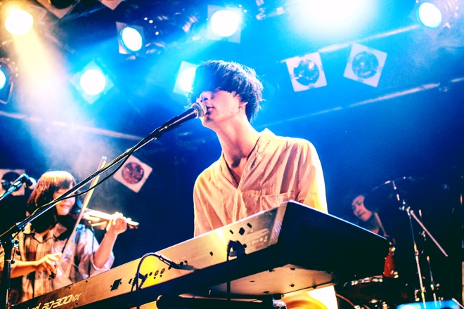 幕が上がるとパジャマに身を包んだサポートメンバーが、舞台にたっていた。足音、笑い声、水音と規則性のないSEが鳴り響く。1ミリも動かない彼らの姿に、会場の時は止まってしまったようだ。目覚ましの音がなり、ようやく彼女は夢を見るは姿を現した。彼の世界観を色濃く映し出された「眠れない僕等の為に」が読み上げられ、会場がグッと前のめりになる。ピアノの弾き語りで始まる「mizuyari」は、バンドというよりも壮大なオーケストラ。その長い指から紡ぎだされるピアノの音色は、全部の悲しみや喜びを背負っているかのような重さがあり、破滅と救いが混在していた。続く「銀の鎖と髪飾り」は美しい物語を歌詞に落とし込んだ曲で、リズムを口ずさむ彼の顔には笑みがこぼれる。「海よ」は美しいピアノのイントロで始まった。弾き語りをする姿は、淡々と歌っているように見えるのだが、声には凄く熱が通っていて思わず聞き入ってしまう。ラストの曲となったのは、大切な友人を思い作られた「夜に帰る」。体のラインも細く、どこか頼りない印象すらある吉屋。しかし、マイクを通して響き渡る歌声は強さしか感じなかった。その歌声に重なるコーラスは讃美歌のようで、教会に響くゴスペルのごとく体の隅々まで音楽が満ちていく。魂を叫ぶように歌う彼の姿に観客の瞳は潤み、いくつもの星が輝いていた。