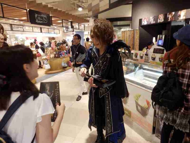 そして3日(土)には、メンバー来店イベントの皮切りに、TERU(Gt)、MASASHI(Ba)、YUKI(Dr)の三人が来店。本人自ら1F店舗入り口にてイベントフライヤーを配布しコラボスイーツのプロモーションを行い、訪れる人を笑顔でエスコートした。だがそれに留まらず、5Fに設置された玉座にメンバーが座ると、ファンは勿論の事、渋谷マルイに訪れていた買い物客の視線をもさらい店内はシャッター音の嵐となった。