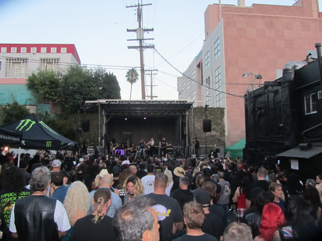 サンセット・ストリップにあるレインボー・バー&グリルでは、数年前よりこの様なバックヤードフェスティバルを年に2回行っており、そこに行けば顔なじみのミュージシャンや音楽関係者でごった返している。日本からは想像もできない様な1980年代LAメタル風のファッションをしている人達もおり、どこからともなく普通にマリファナの匂いがただよってくる光景だ。またそれぞれの個性を表現できるので、音楽ネットワークを作るのにも良い場所となっている。ジョン・レノンやジミー・ヘンドリックス、ジャニス・ジョップリンなどをはじめ世界中のミュージシャン達がここでハングアウト(たむろ)していた聖地だけに、著名ミュージシャンもこの日遊びに来ていた。どんなにビッグネームでもレインボーに行けば皆仲間なので、「呑んで食べてロックンロールする」という世界がそこには今も顕在だ。