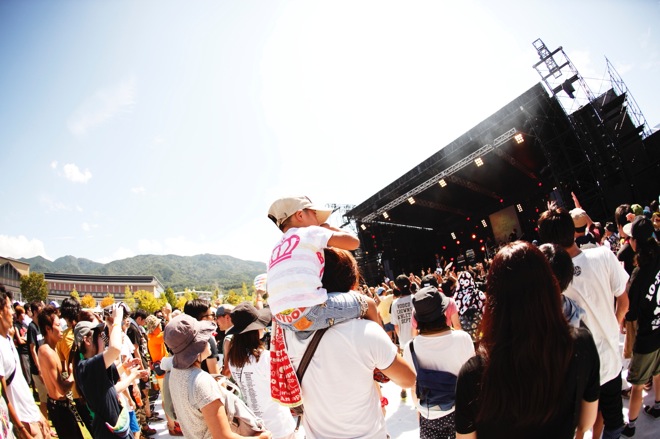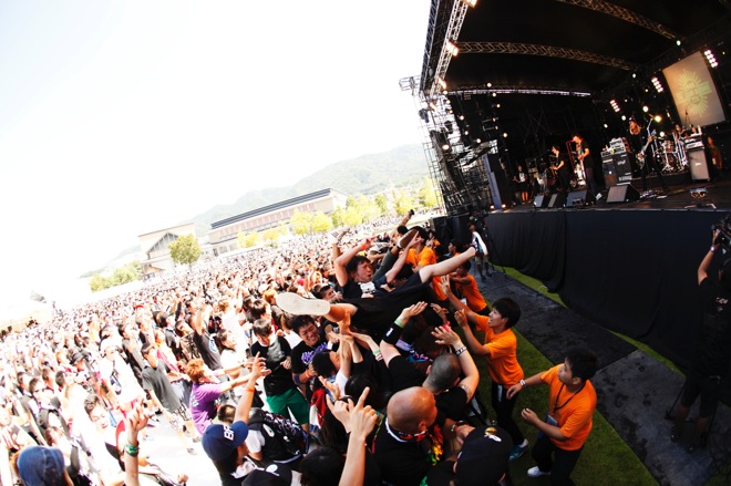 エッジの効いたメロディックパンクと熱き歌心がマッチングした「TRUE ROMANCE」、オーディエンスへ自らの心の中でまず革命を起こす大切さを伝え、「何をやってもいい! 恐れることはない! この世は君のモノだから!」とNAMBAが叫んでからの「WORLD IS MINE」で大切に大切に音と言葉を紡ぎ、この<中津川 THE SOLAR BUDOKAN>の発起人であるシアターブルックの佐藤タイジへの想いを述べた後、「TAKE ME HOME COUNTRY YARD」では壮大なシンガロングを巻き起こす。